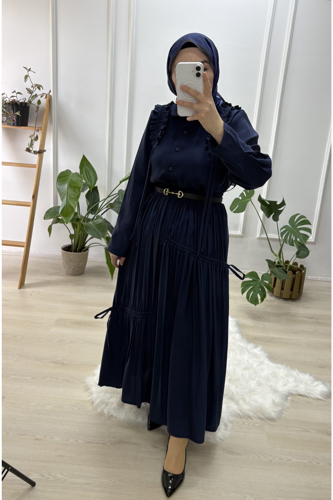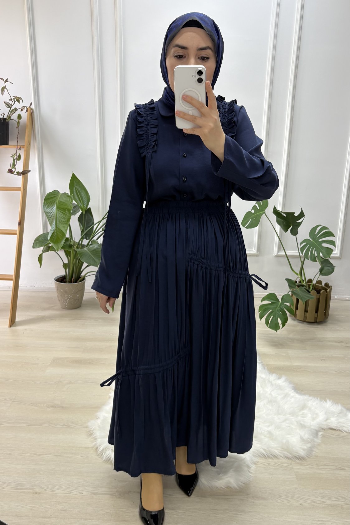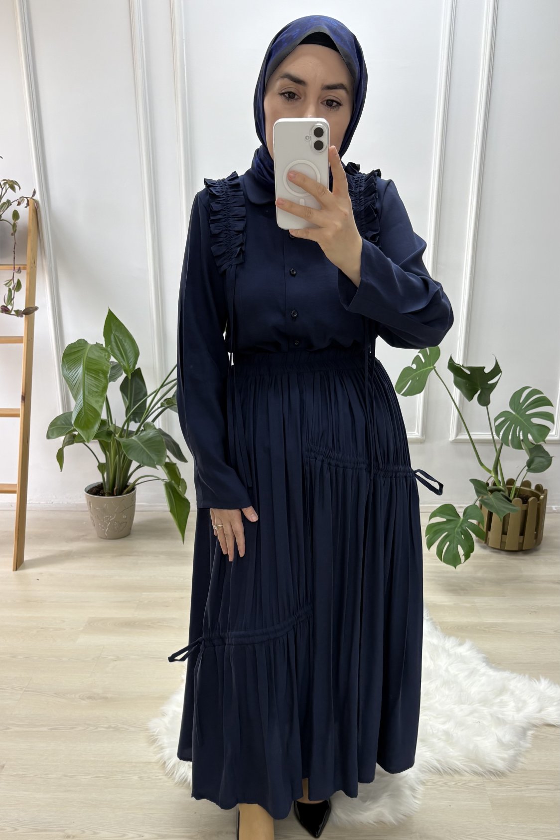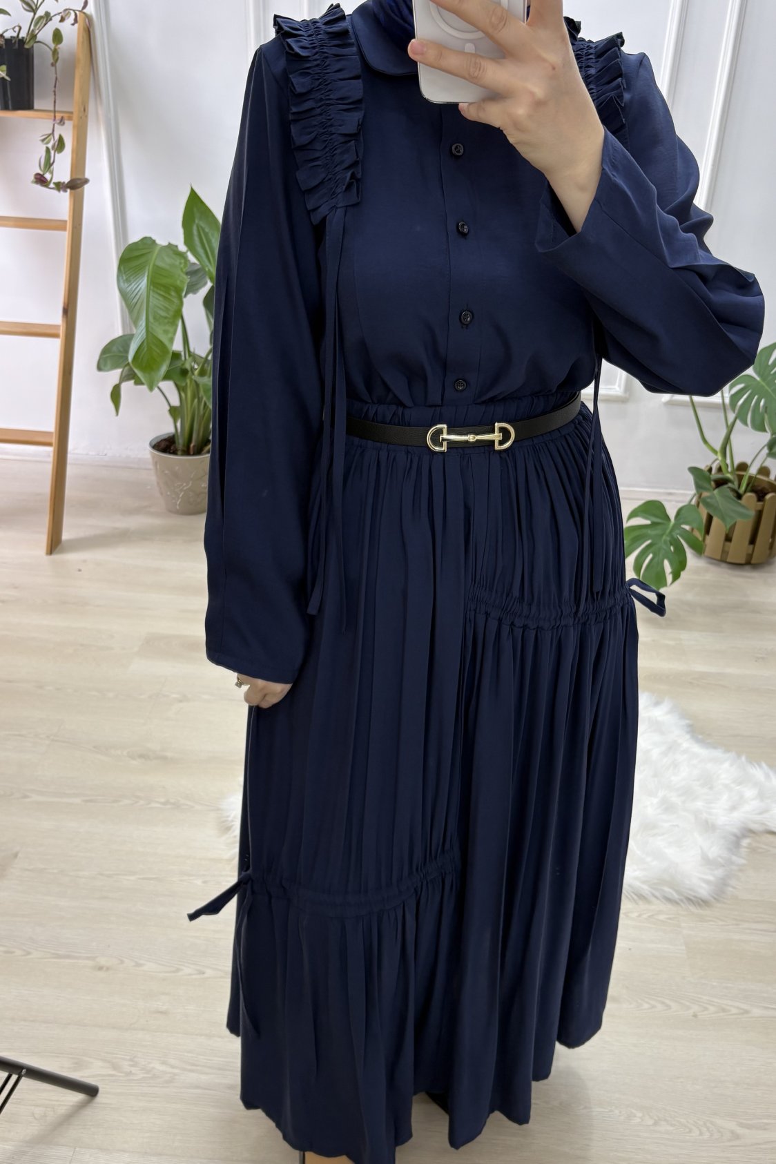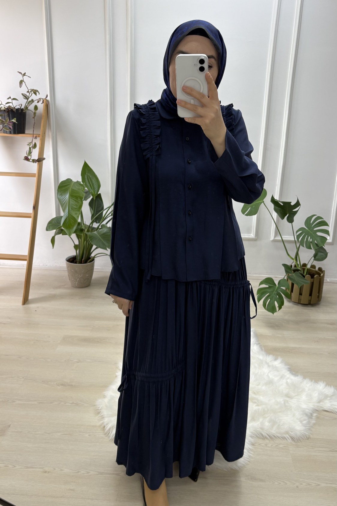 Gala Omuz Fırfır Detay Takım Lacivert (Kordon Detaylı Etek)
